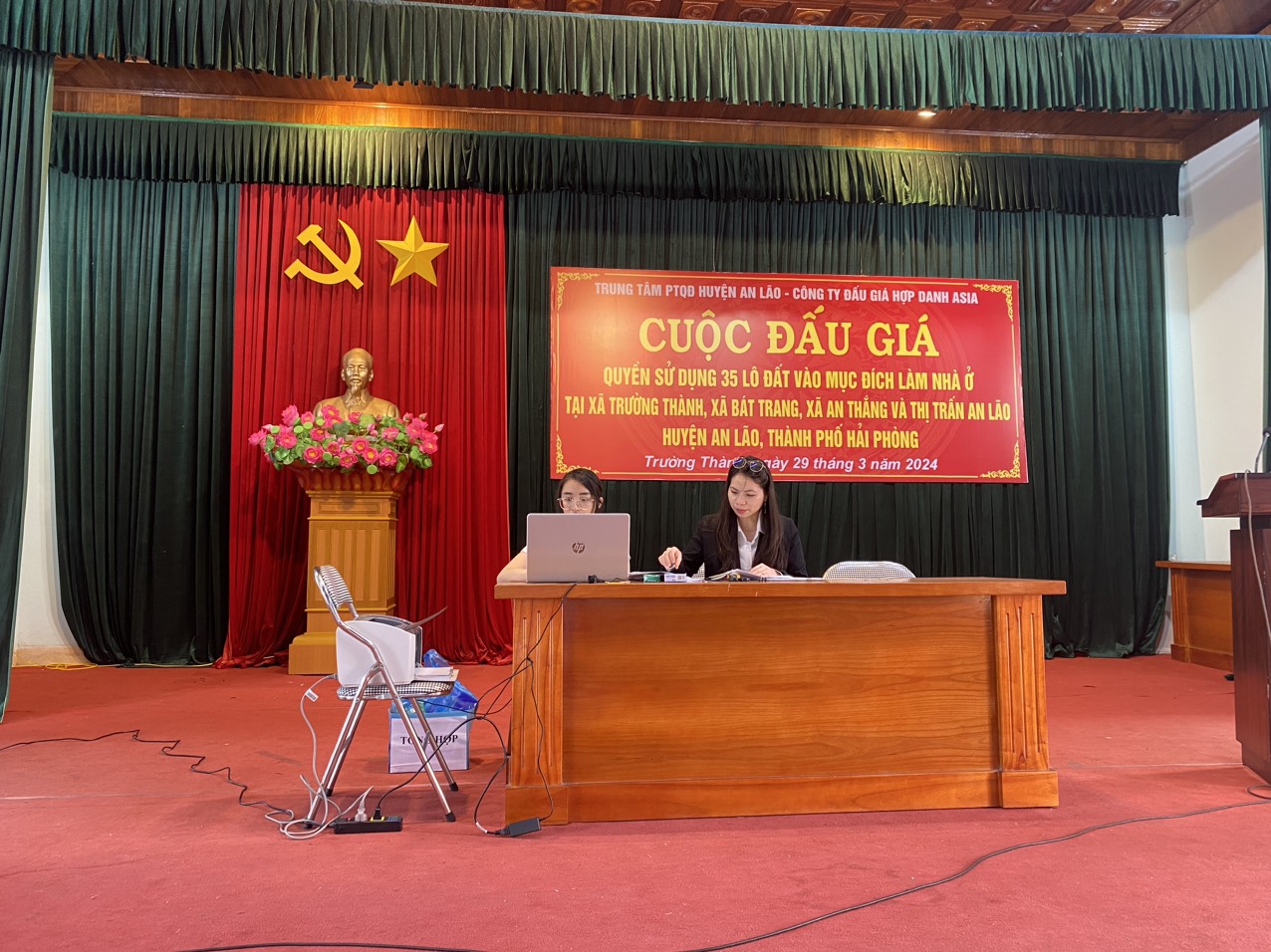 Sáng 29/3/2024 tại Nhà văn hóa xã Trường Thành huyện An Lão, Trung tâm phát triển quỹ đất huyện An Lão phối hợp với Công ty Đấu giá hợp danh ASIA tổ chức đấu giá Quyền sử dụng đất ở đối với 35 lô đất tại các xã An Thắng, xã Trường Thành, Xã Bát Trang, thị trấn An Lão, huyện An Lão. Tổng diện tích lô đất đấu giá là 5.510,71m2.